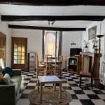 Belle pièce à vivre avec cheminée, espace salon et coin repas, accès à la petite terrasse