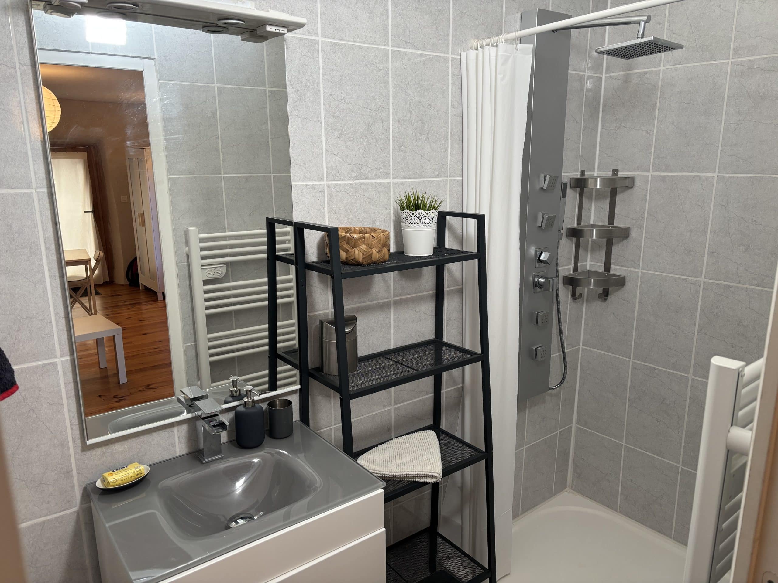 Salle de bain : douche, sèche-cheveux