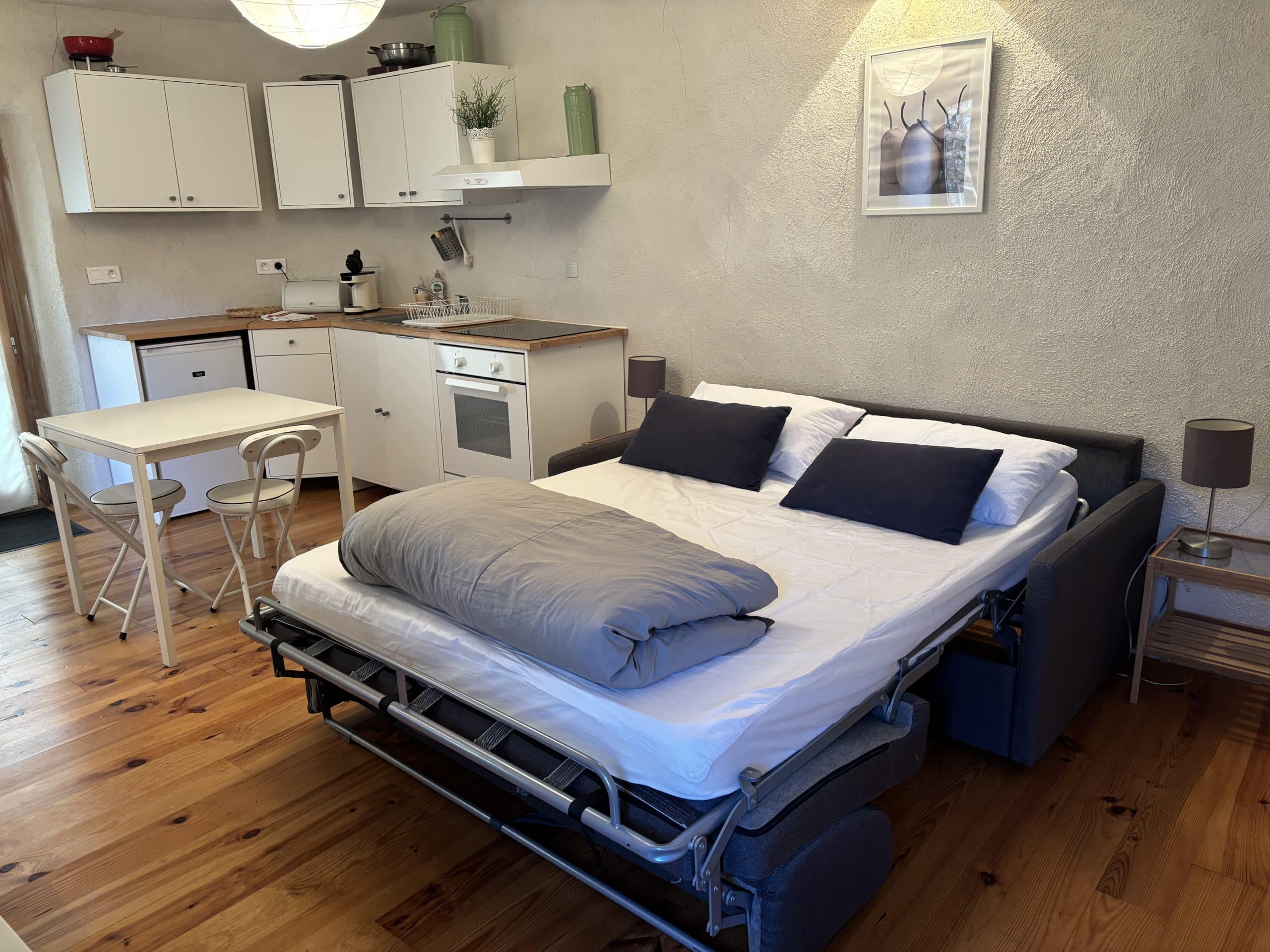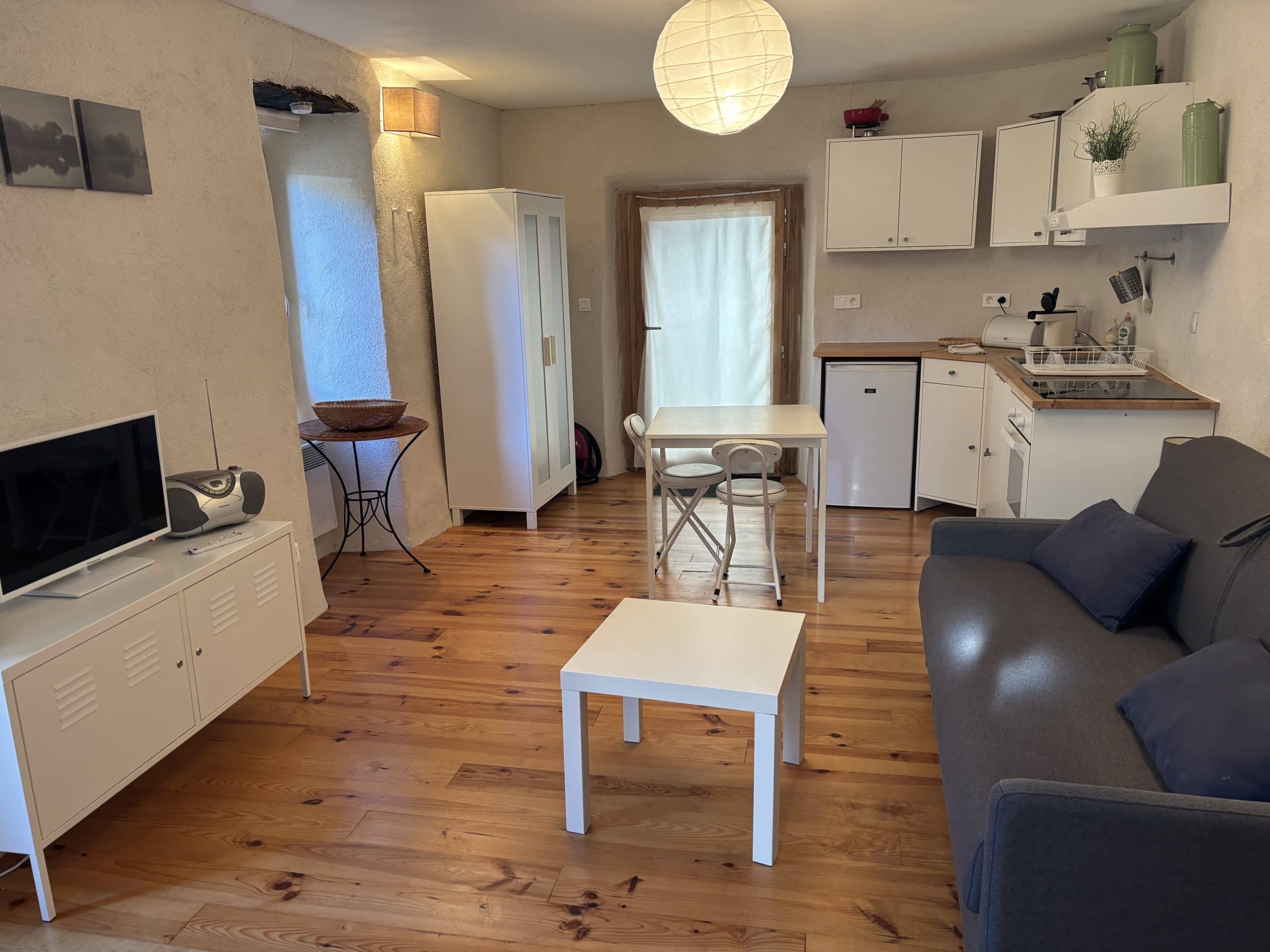 Cuisine : équipée, machine à café Senseo, micro ondes, plaques à induction et four.